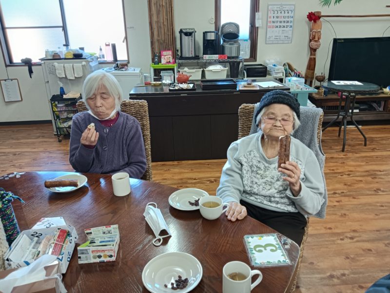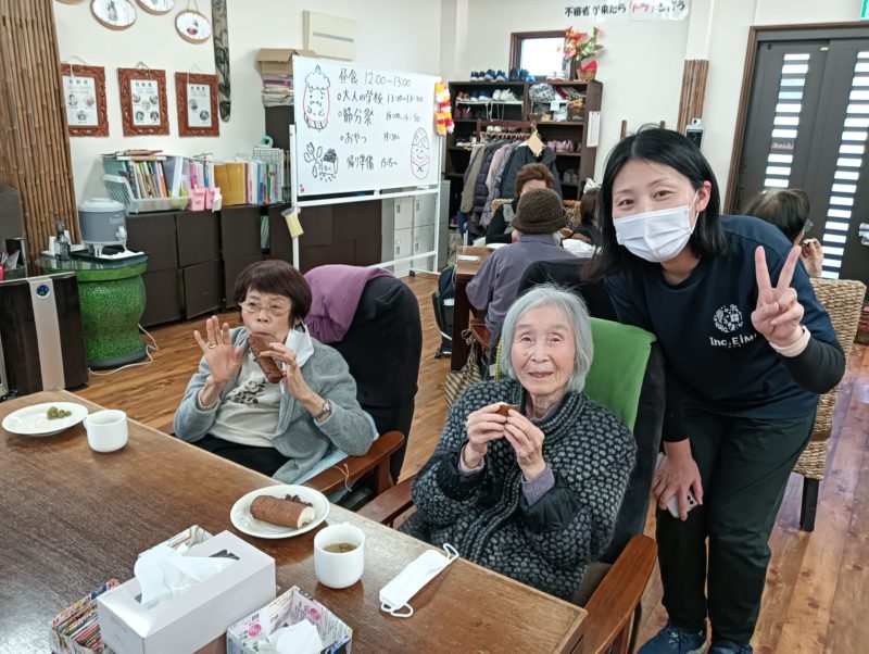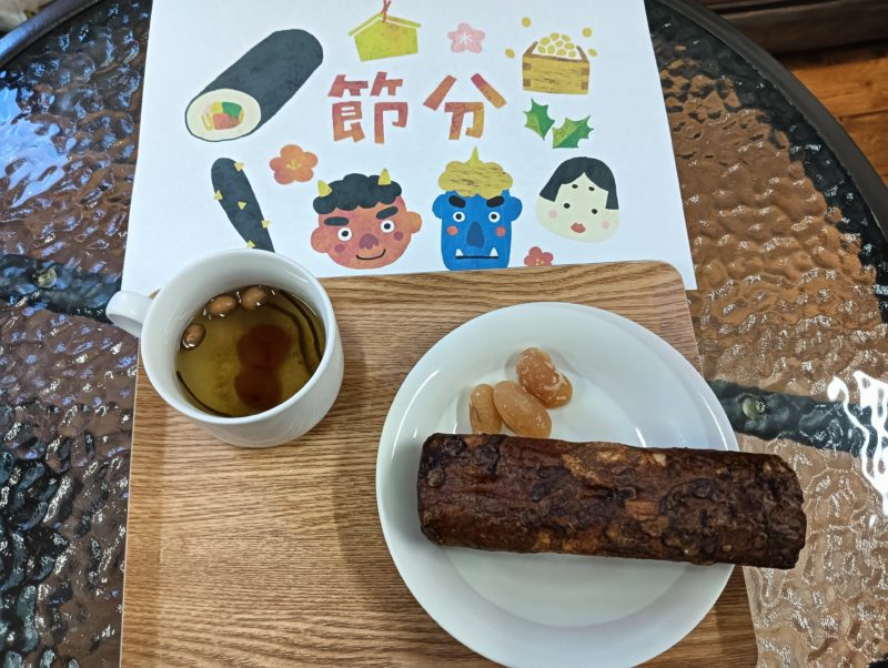 そして本日のおやつは恵方巻に見立てた麩菓子と甘納豆と福茶を召し上がっていただきました♪