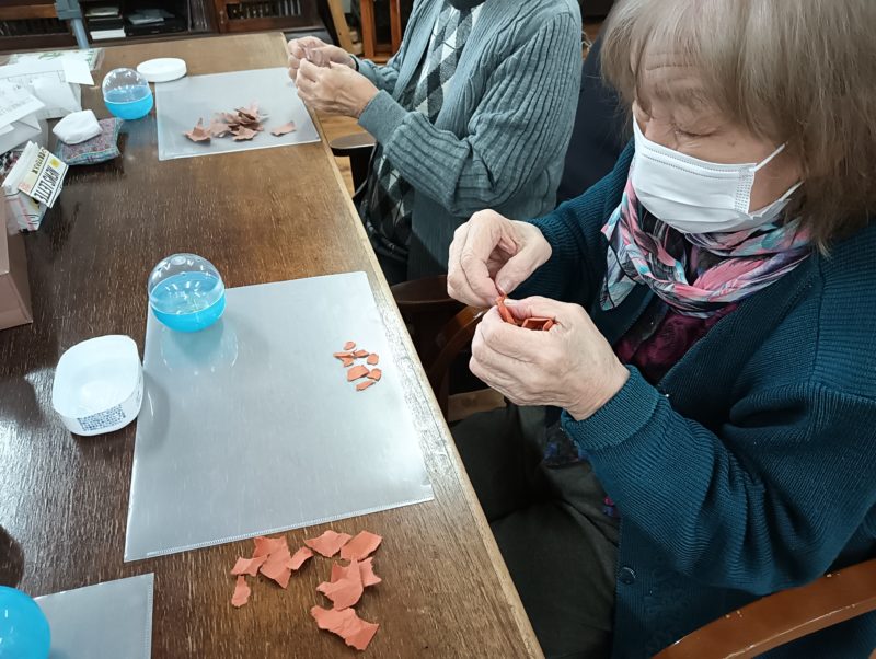 まずは画用紙をしっかりもんでくしゃくしゃにしてからちぎっていきます。土台のカプセルにちぎった画用紙を隙間なく丁寧に貼っていきます。手指に力がいる作業なので手指のトレーニングになりますね!